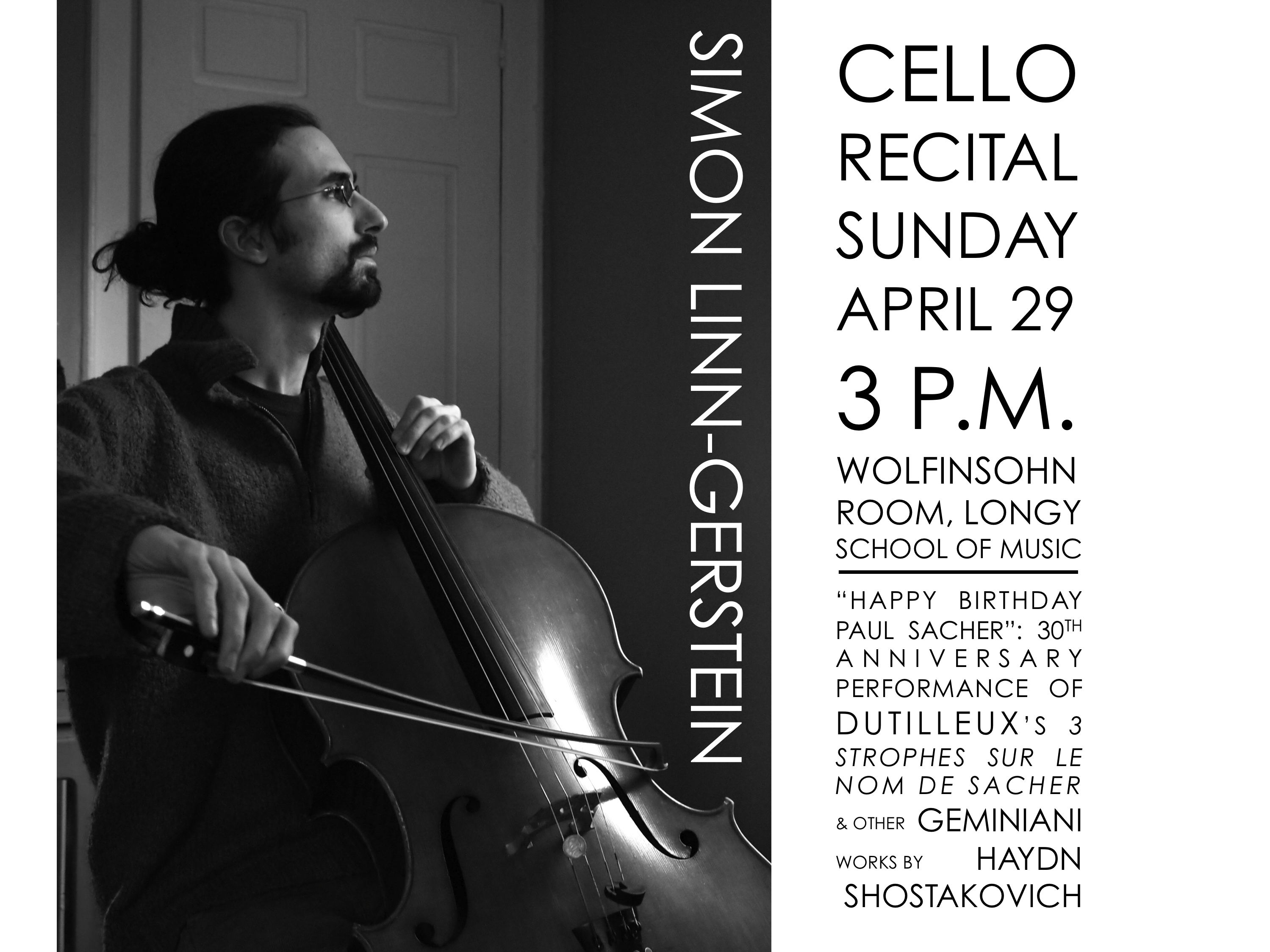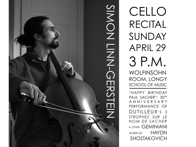 Simon Linn-Gerstein Cello Recital, Sunday April 29, 2012, 3 p.m. Wolfinsohn Room, Longy School of Music. “Happy Birthday Paul Sacher”: 30th Anniversary Performance of Dutilleux’s “3 Strophes sue le nom de Sacher”, and other works by Geminiani, Haydn, and Shostakovich